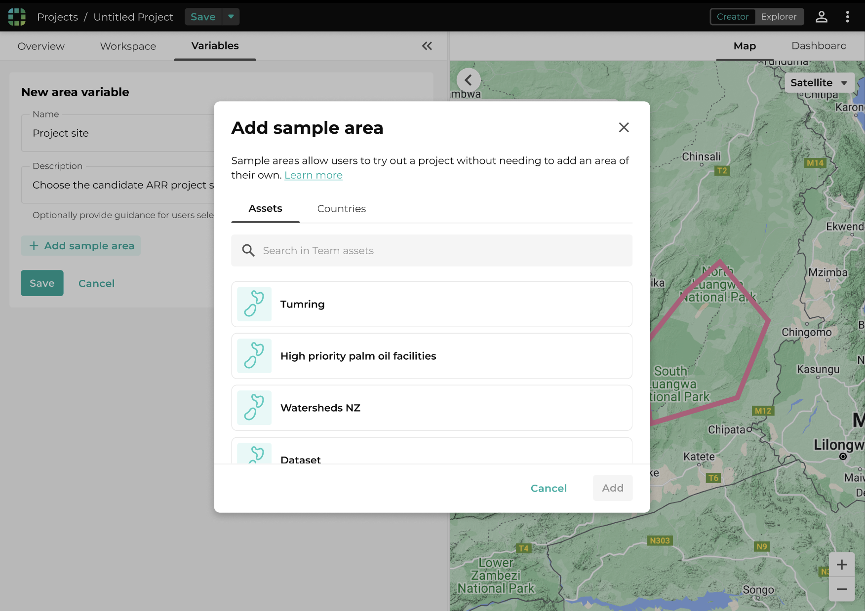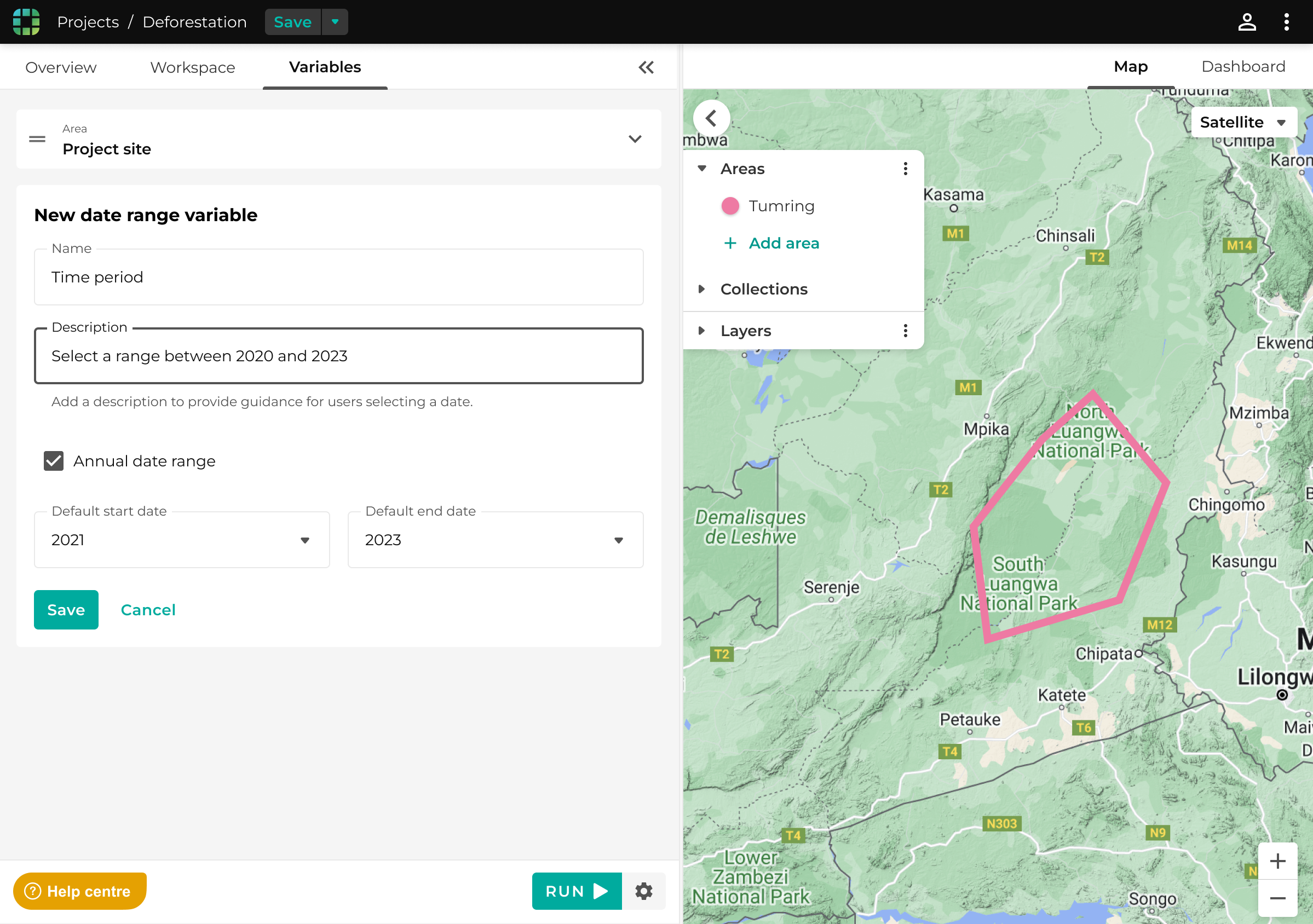 To allow specific inputs (areas, dates, and numeric values) to be set by users of a template, Creator users can add ‘variables’. These variables are plugged into the existing workflow, and allow Explorer users to set parameters and select locations through a separate interface, preventing accidental changes to workflow logic.