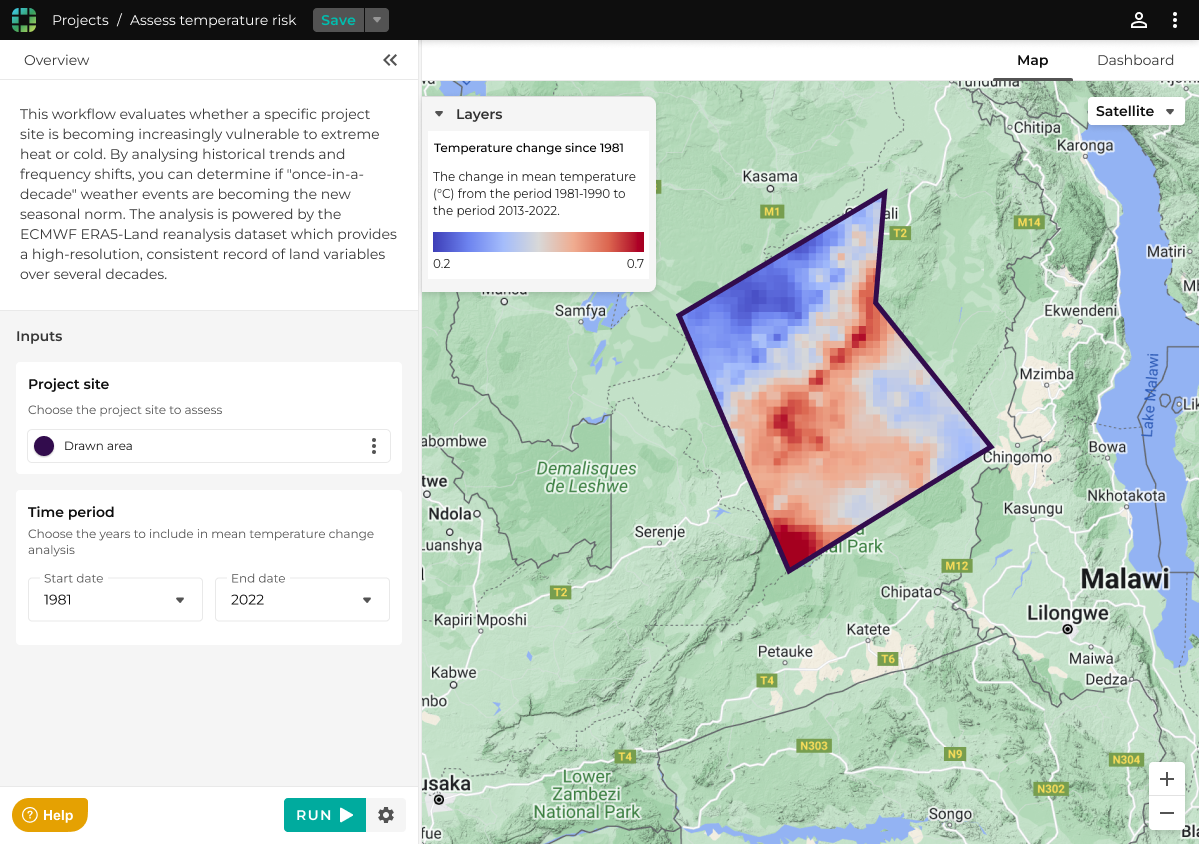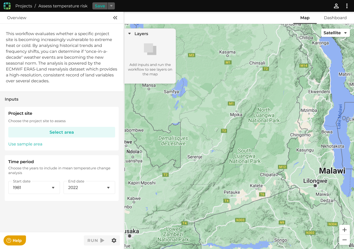 Removed the workflow builder interface, and instead showed a stripped back interface for Explorer users to select a location to analyse, as well as a date range for the analysis