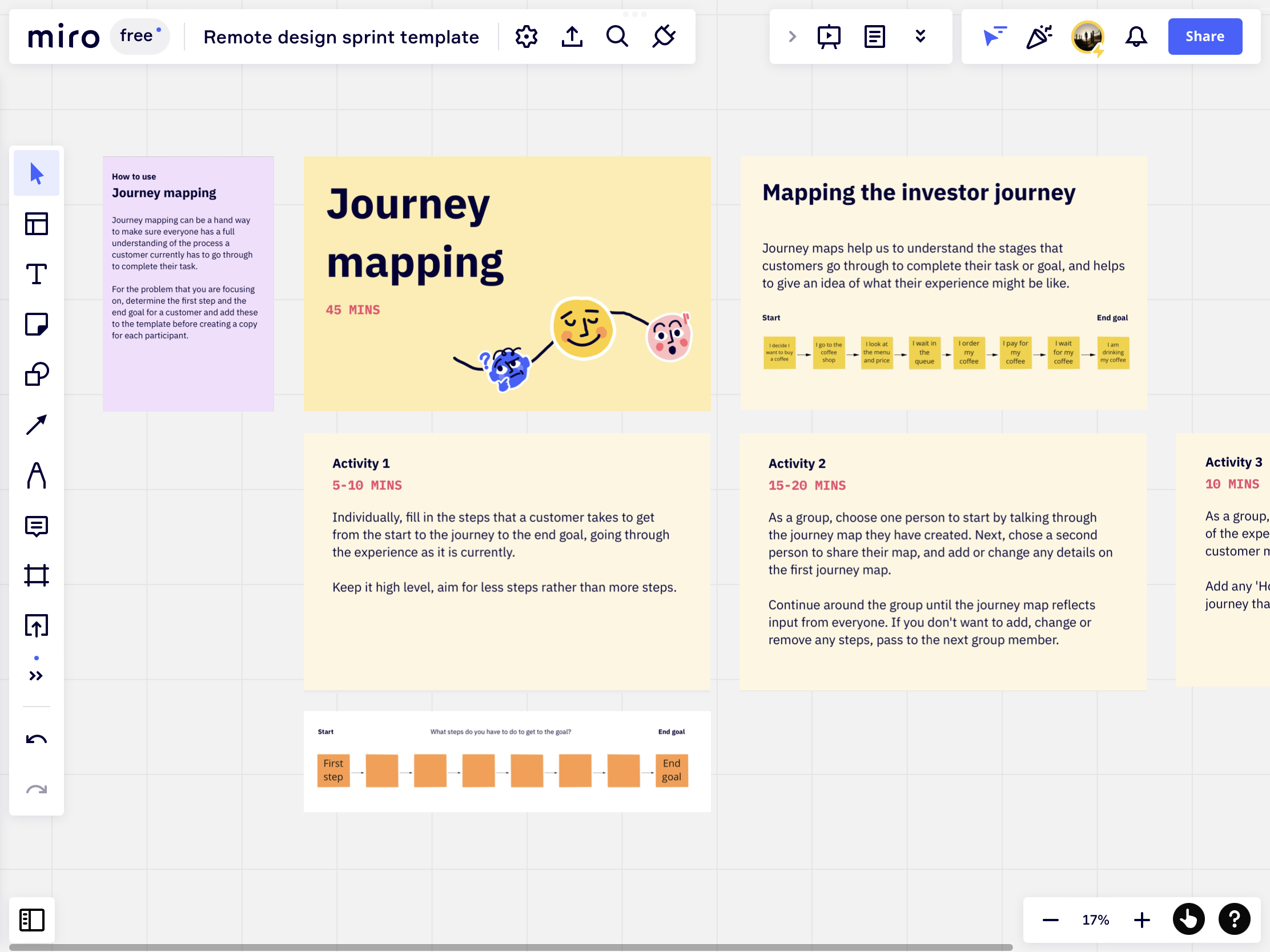 I took the structure and workshop activities that we had put together, and created a design sprint template in Miro that could be used for future design sprints, iterating and tweaking based on feedback from participants.